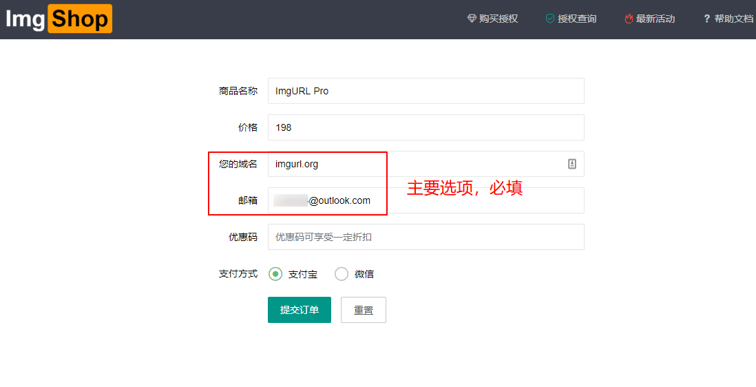 访问:http://shop.imgurl.org/order 进行在线下单(推荐用电脑操作),填写您的域名和邮箱(注意:是单域名授权,因此请填写完整的域名。比如您打算在test.xxx.com使用,应该填写test.xxx.com而不是xxx.com),目前支持支付宝、微信扫码付款。